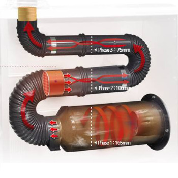 - Iespēja uzstādīt no nerūsējošā tērauda pārvadcauruli (siltuma caurule / kondensatora caurule / dūmvada caurule) sadegšanas procesa rezultātā izdalītajai siltumenerģijai, piemēram, citā telpā, otrajā stāvā vai ārkārtējos gadījumos ārā no ēkas, lai gan tas nav nepieciešams